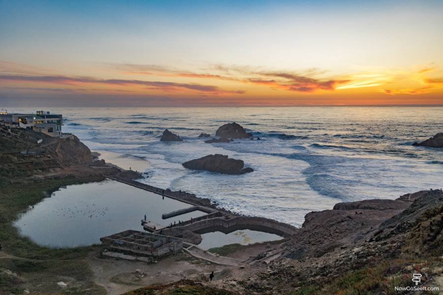 In the Lands End area of San Francisco, a once-great seaside bathhouse lays in ruin at the shore. Visitors can walk the beach and shore to see the ocean slowly reclaim the building.