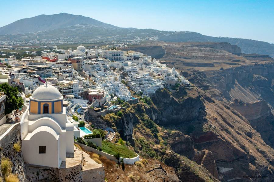 Santorini’s famous views come from a volcano that collapsed into a flooded caldera, leaving clifftop towns like Fira and Oia perched above the water. Expect steep terrain, stairs, and epic caldera viewpoints along the rim path between Fira, Firostefani, and Imerovigli.