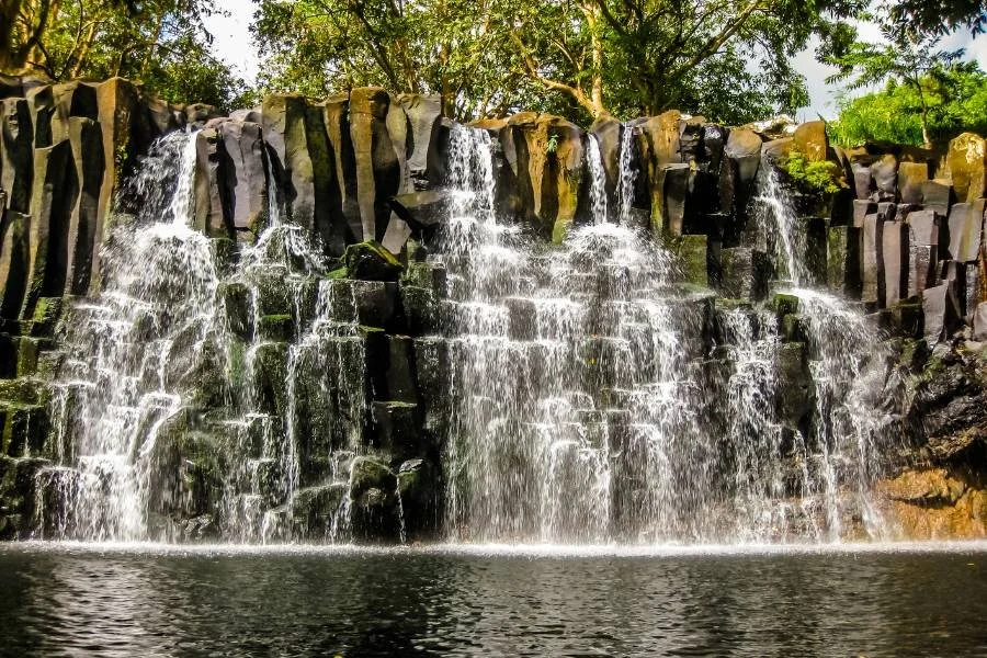 Rochester Falls is one of the most accessible waterfalls in Mauritius. The falls are known for their unique rock formations, with water cascading over large, rectangular basalt columns. The pool at the base is deep enough for swimming, though the rocks can be slippery. Local kids often jump from the rocks into the water, but caution is advised. The falls are located near the town of Souillac and can be reached via a short walk from the parking area. The road leading to the falls is rough, so a 4x4 vehicle is recommended.